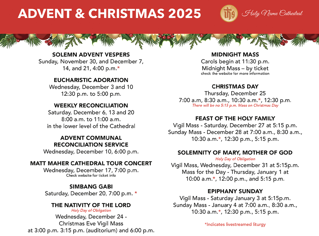 Come join us for a special night of worship at Holy Name Cathedral! This event is a time to gather together as a community and celebrate the season of Advent through music, prayer, and reflection. Let’s come together to prepare our hearts for the coming of Christ. All are welcome to attend this evening of praise and worship.
