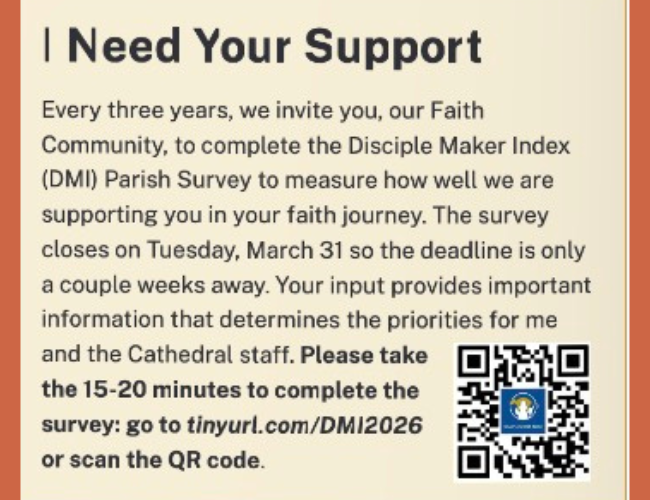 It’s official! The Disciple Maker Index (DMI) Survey is a great way to reflect on your own spiritual growth while helping our parish plan for the future. Please help by completing the short, 10-15 minute survey as soon as possible.