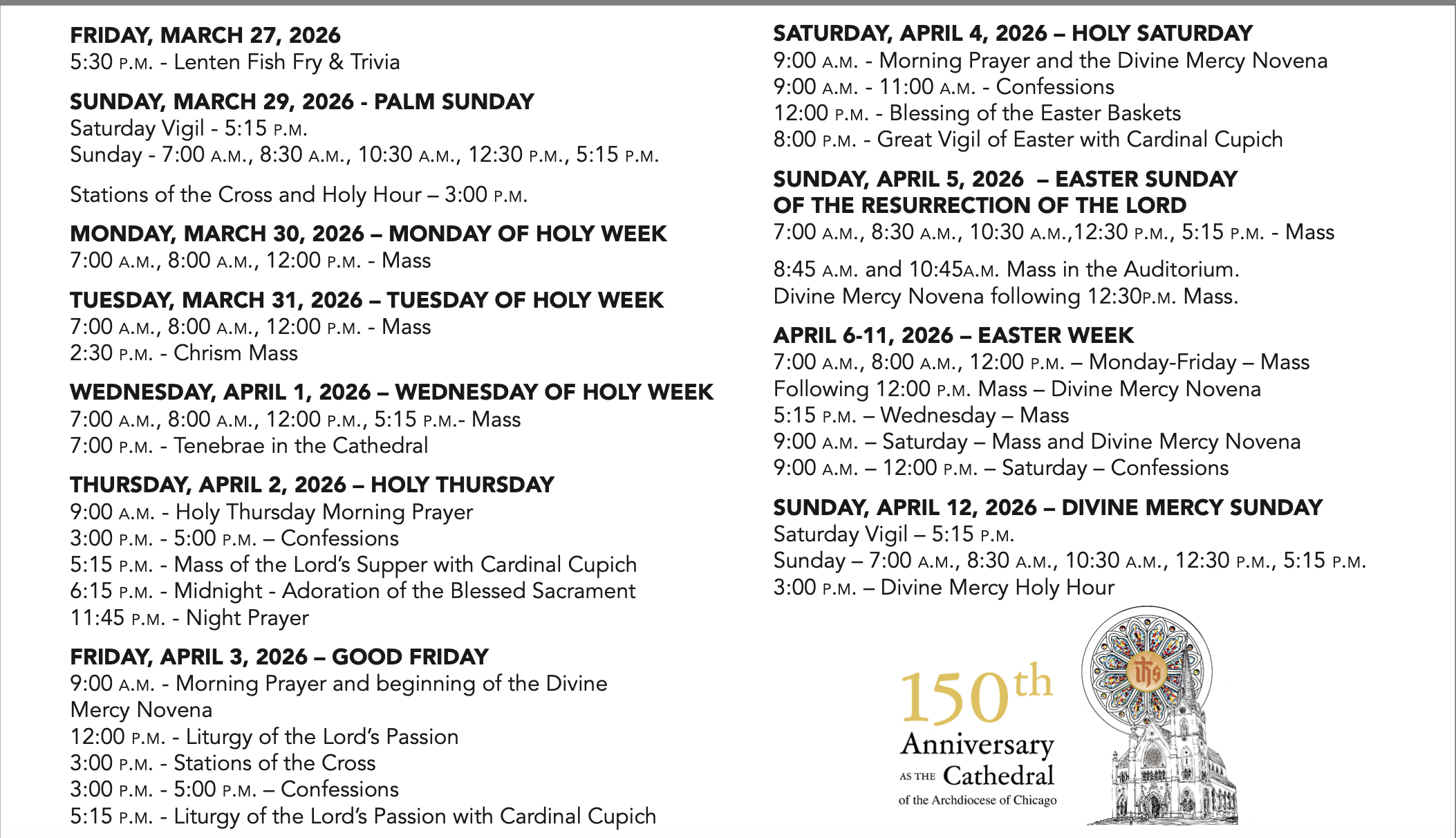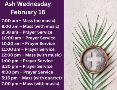 Lent is a 40 day season of prayer, fasting, and almsgiving that begins on Ash Wednesday and ends at sundown on Holy Thursday. It’s a period of preparation to celebrate the Lord’s Resurrection at Easter. During Lent, we seek the Lord in prayer by reading Sacred Scripture; we serve by giving alms; and we practice self-control through fasting. We are called not only to abstain from luxuries during Lent, but to a true inner conversion of heart as we seek to follow Christ’s will more faithfully. We recall the waters of baptism in which we were also baptized into Christ’s death, died to sin and evil, and began new life in Christ.